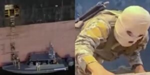 Dalam unggahan akun X, @mog_ressEN pada hari yang sama, terlihat perahu kecil mendekati kapal kargo yang berisi pasukan bertopeng dengan perlengkapan senjata lengkap menaiki vessel bertuliskan ‘MSC’.